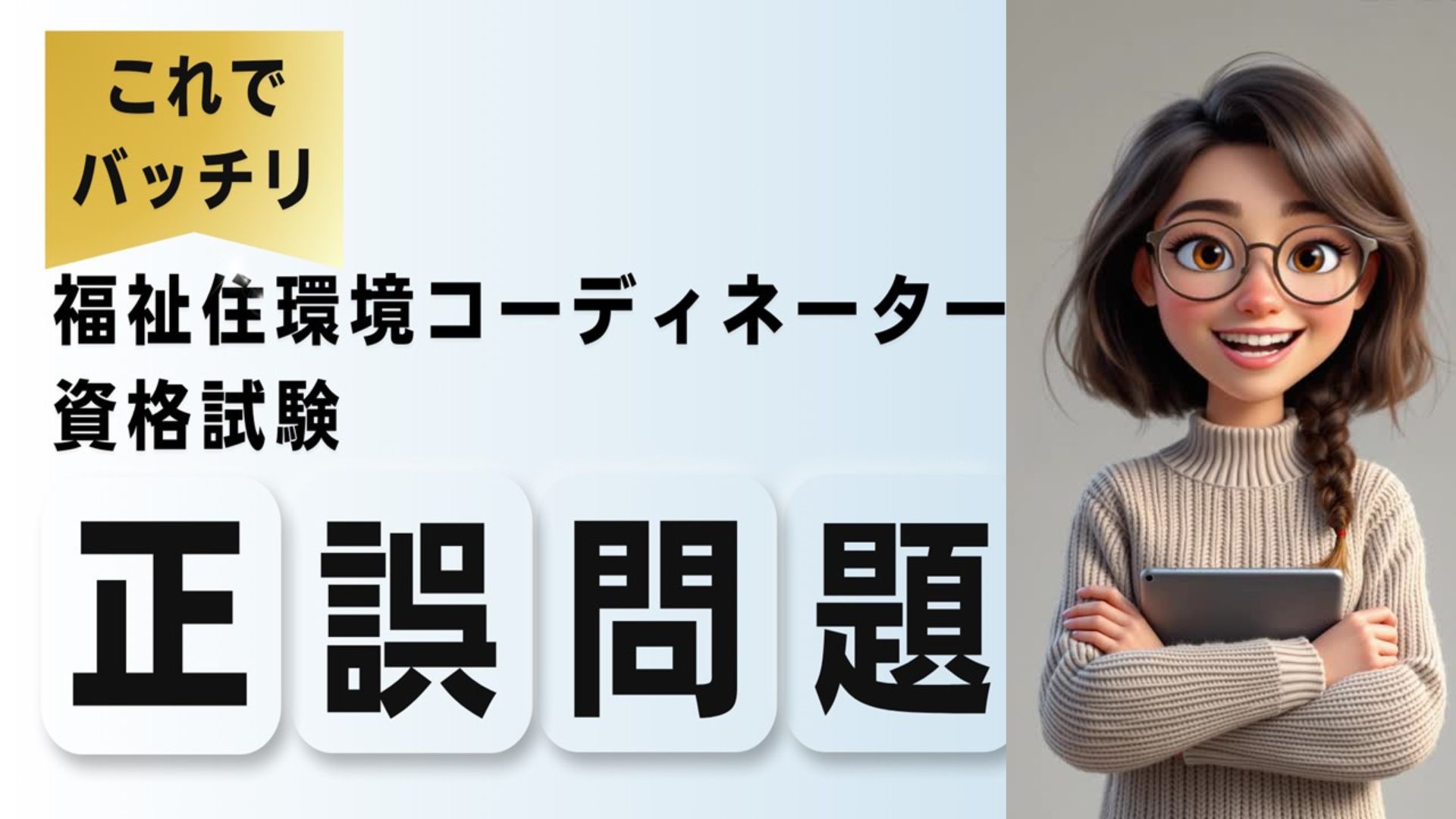 福祉住環境コーディネーター1-12の〇×問題です。分野ごとに7問、正誤問題を出題します。資格試験の合格点(70点で合格)をデジタル教材を利用して短期間でとることが出来るようにお手伝いします。